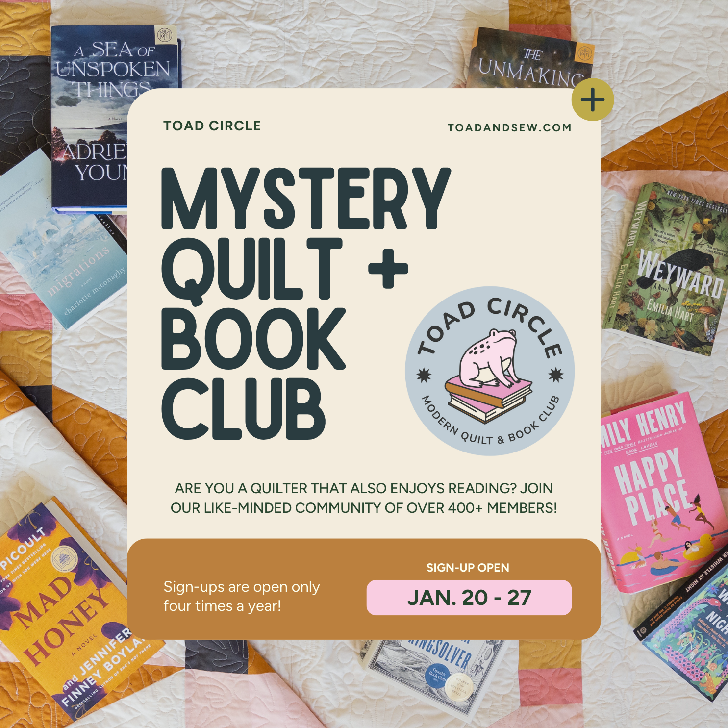This is a space where hobbies combine. The book club + mystery quilt SAL is an event that opens once every 3 months. It consists of a 6-8 week long book club + SAL with lots of extra goodies along the way! Learn more about what to expect from Toad Circle and the Mystery Quilt SAL!